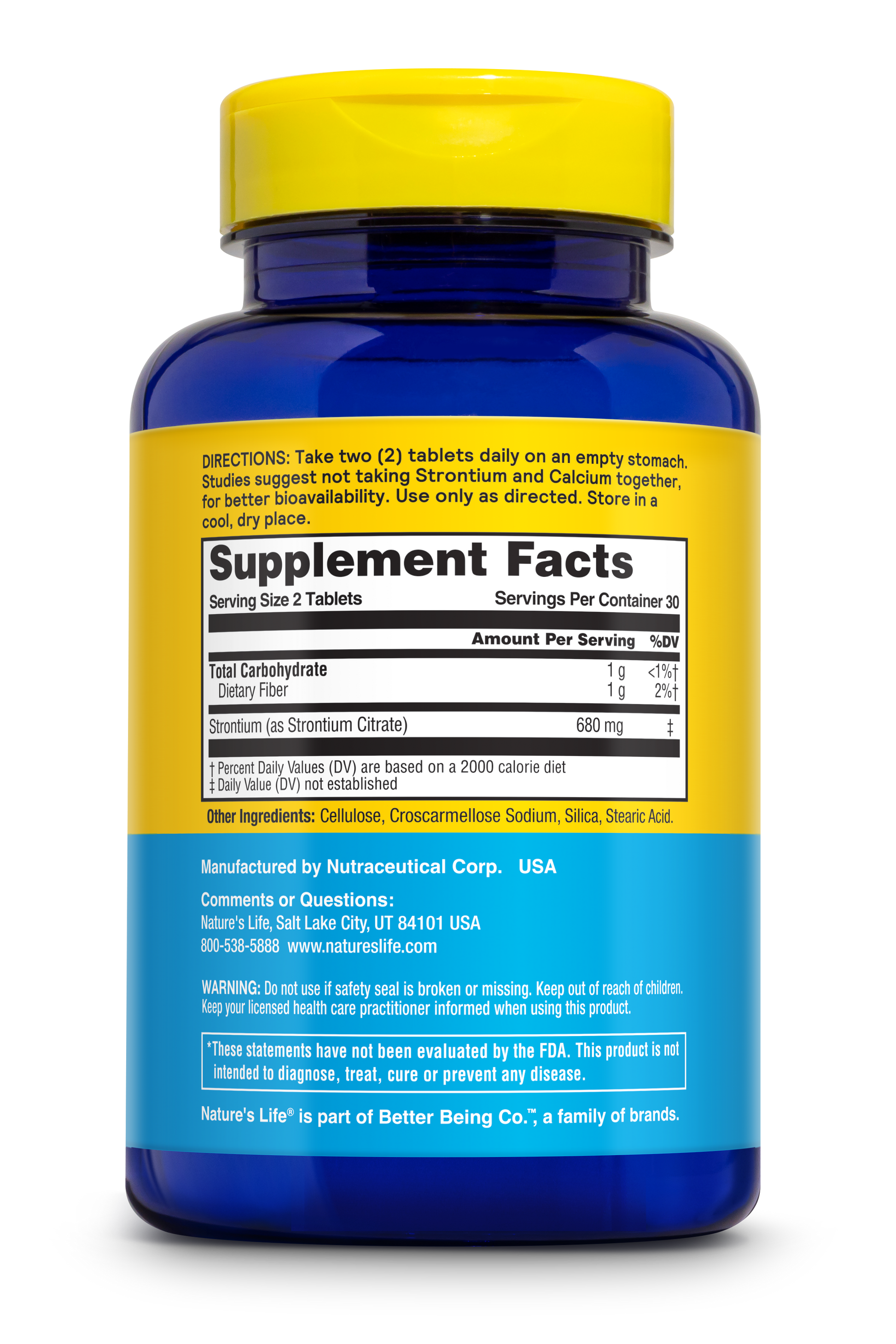 Take two (2) tablets daily on an empty stomach. Studies suggest not taking Strontium and Calcium together, for better bioavailability. Use only as directed. Store in a cool, dry place.